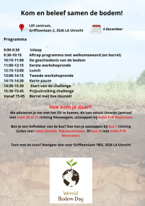 Op 4 december a.s. vindt in de inspirerende omgeving van het Lef Future Center van Rijkswaterstaat in Utrecht de Nederlandse versie van de Wereldbodemdag plaats. De organisatoren (Rijkswaterstaat, NL Ingenieurs, Deltares, Platform Bodembeheer en Jong Bodem) hebben een veelzijdig én spannend programma samengesteld: mét workshops, een Challenge en live-muziek. Om samen met alle deelnemers de bodem te beleven.